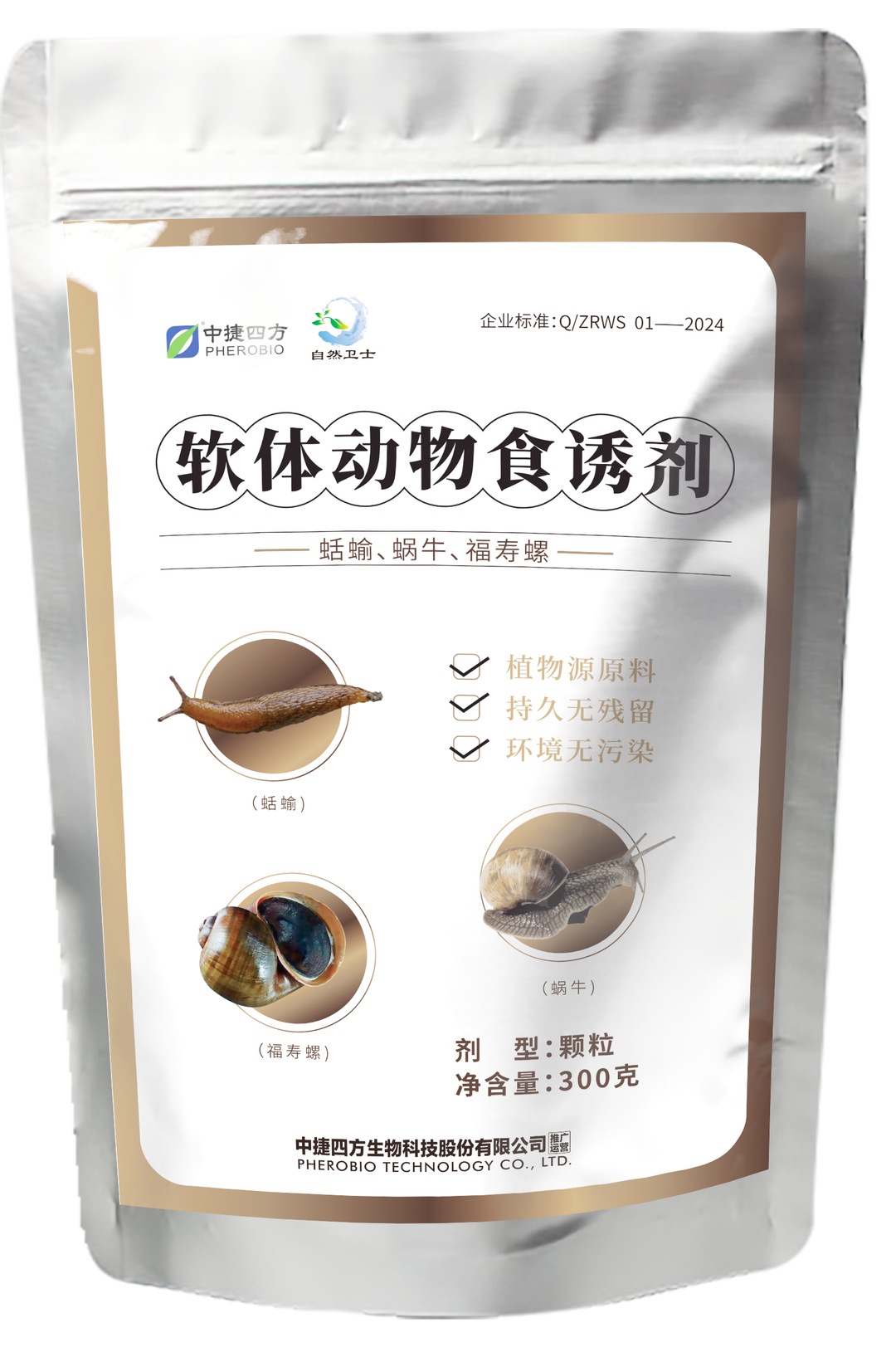中捷四方软体动物食诱剂,主要成分为酵母、中草药等有机物质,是一款植物源食诱剂,能持续释放特定气味信息,引诱福寿螺、蛞蝓等软体动物前来取食、聚集,吞食食诱剂后物理破坏消化系统进而死亡(胀死了)。